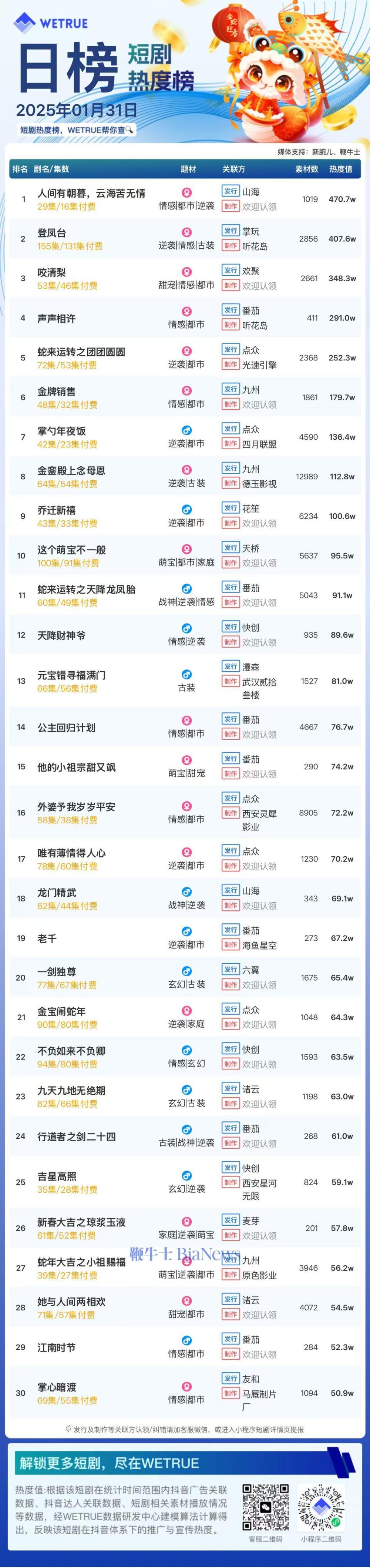 鞭牛士 2月1日消息,编者按:为帮助短剧从业者提供更多信息,专注于短剧报道的新腕儿和科技媒体鞭牛士联合WETRUE短剧热度榜共同推出短剧热度榜。