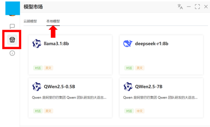 第二步:成功安装并登录后,点击左侧图标“模型市场”,并选择“本地模型”,就可以看到DeepSeek-R1-8B的本地模型。