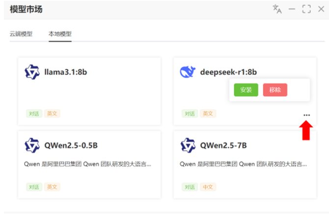 第三步:点击“...”后,选择“安装”,即可自动下载安装DeepSeek模型。