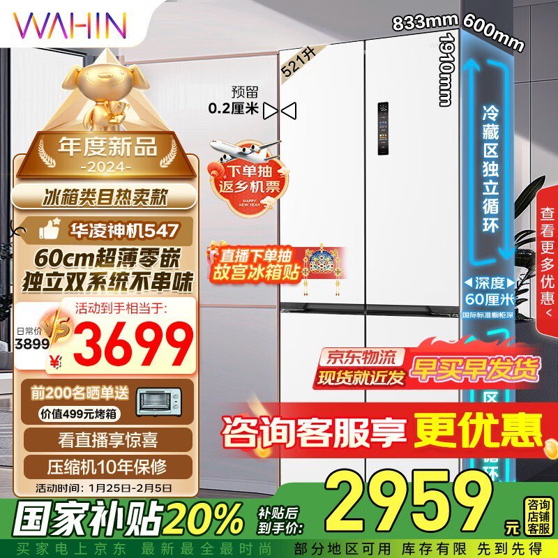 华凌神机547双系统不串味60cm超薄零嵌冰箱 2928元