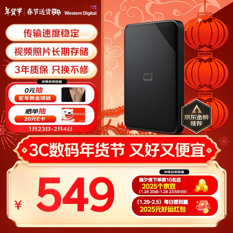 京东黑五大促!西部数据2TB USB3.0 移动硬盘到手价526元