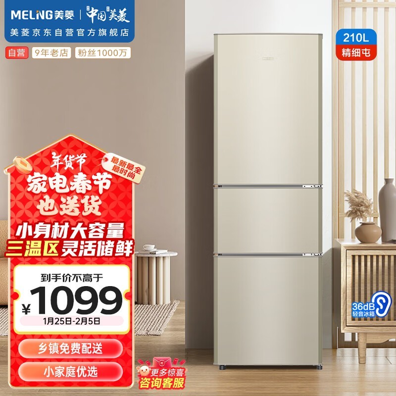 租房适用!美菱三门冰箱仅售1049元