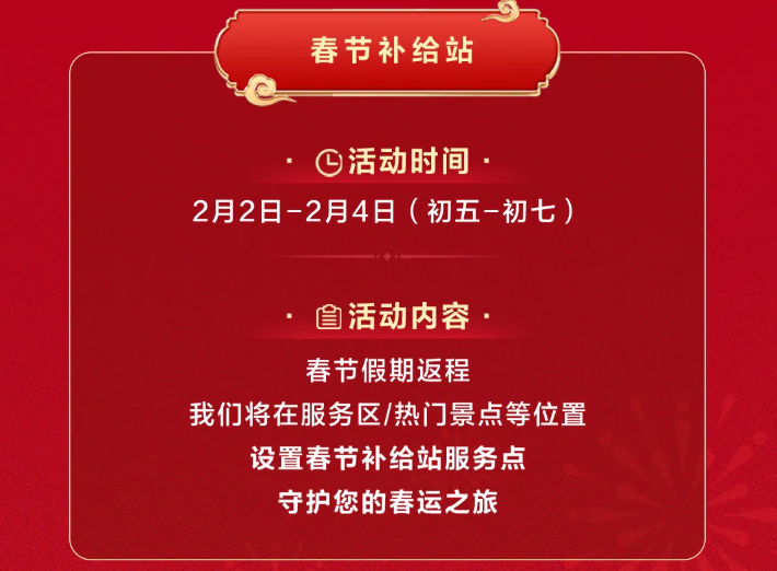 在返程高峰期,即2月2日 - 2月4日,鸿蒙智行在部分高速服务区和热门景区设立“春节补给站”。在这里,车主们不仅能领取到零食饮料补充能量,还能获得医用应急包以备不时之需,同时还提供胎压检测服务,保障行车安全。这些贴心的服务,让车主在疲惫的旅途中感受到家一般的温暖。