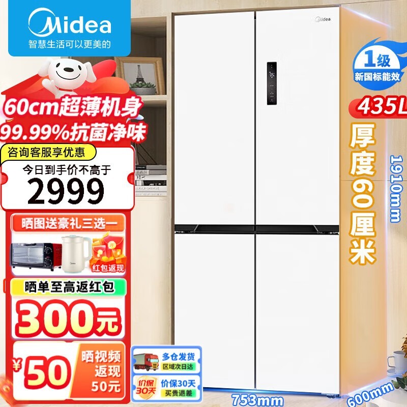 美的(Midea)MR-456WSPZE十字四开门冰箱只要3299元