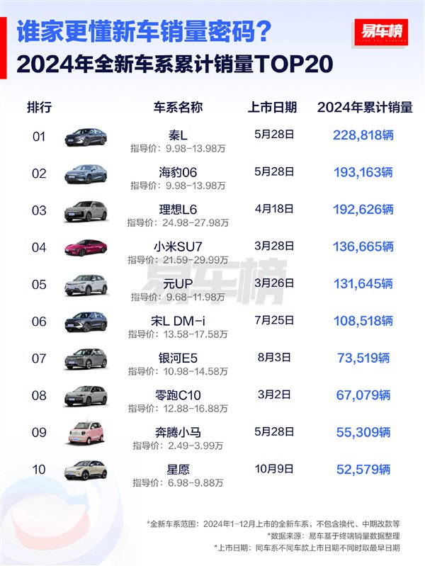 快科技2月2日消息,易车榜根据终端销量数据,整理了2024年上市的全新车型销量Top20榜单。