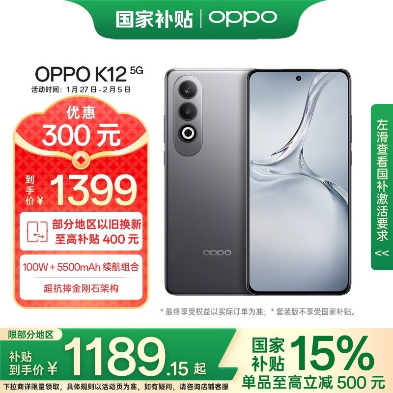 OPPO K12 5G手机京东立减300元到手价仅需1181元