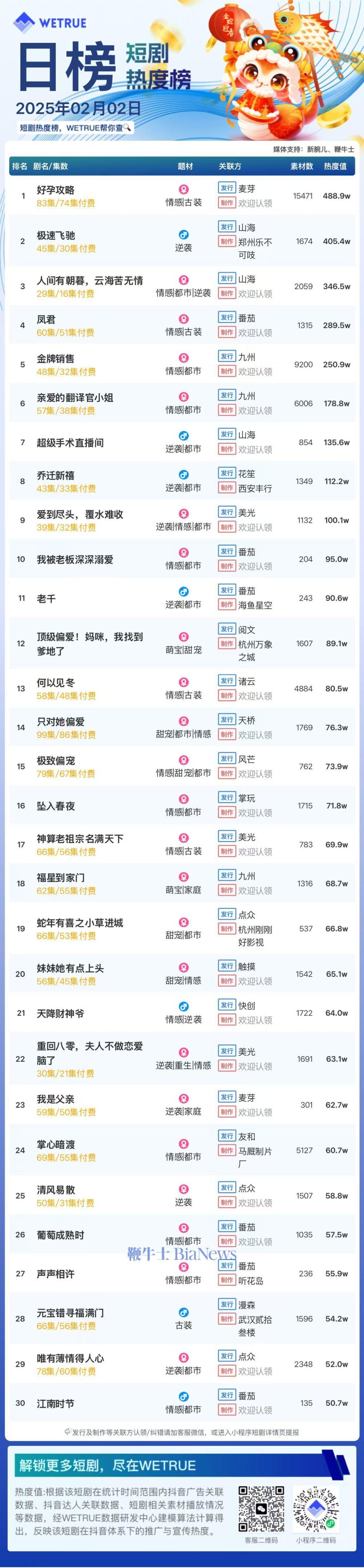 鞭牛士 2月2日消息,编者按:为帮助短剧从业者提供更多信息,专注于短剧报道的新腕儿和科技媒体鞭牛士联合WETRUE短剧热度榜共同推出短剧热度榜。