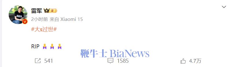 大S去世,雷军发文悼念