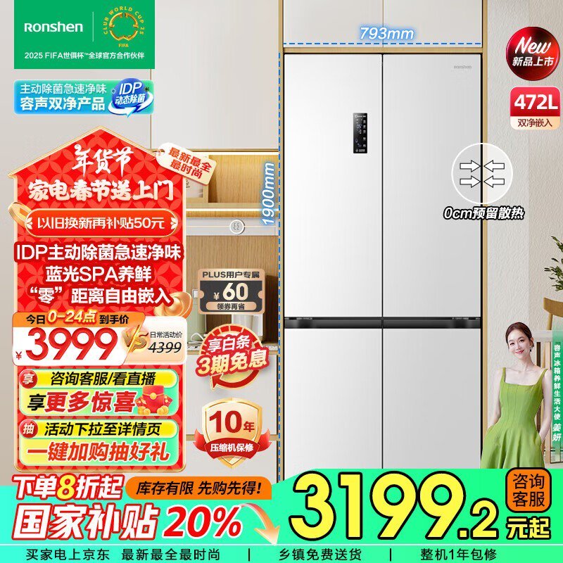 大家庭适用 容声472升白超薄零嵌电冰箱优惠价仅需2966元