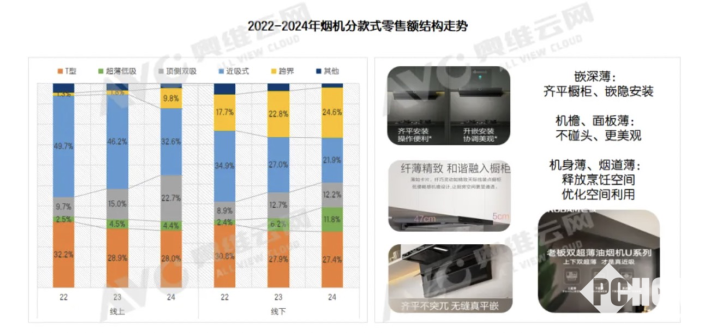款式结构的变化一直是推动烟机市场不断发展的重要推力,2025年以“薄”为基础的“一体化嵌隐”仍是烟机的重要竞争方向。2024年线上、线下新款式(超薄+顶侧双吸+跨界)累计零售额份额分别为36.9%、48.6%,同比分别增长15.6%、7.0%。