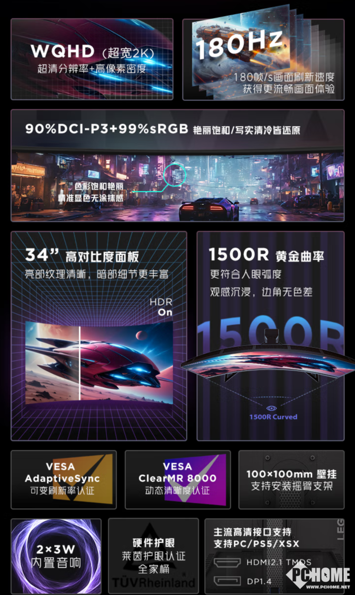 拯救者R34w-30配备一块34英寸的VA曲面屏,分辨率为WQHD(3440 × 1440),刷新率为180Hz,曲率为1500R,显示比例为21:9,响应时间(GtG)为0.5ms~5ms(可调),典型亮度为350尼特,静态对比度为3000:。色彩方面,这块面板色深为8bit,DCI-P3色域为90%,sRGB色域为99%,支持HDR10和AMD FreeSync技术,得到了VESA Adaptive-Sync可变刷新率认证、以及VESA ClearMR 8000运动模糊认证。该款显示器还支持全局DC调光无频闪,得到了德国莱茵TÜV硬件护眼和Eyesafe 2.0护眼等一系列认证。另外提供了LADM驱动多色彩模式可调,支持暗部增强技术,提升黑暗环境下的显示细节,并提供了屏幕准心和滤镜等游戏工具。