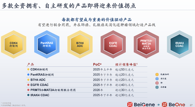 百济神州此前的管线其实是有些“单薄”的,基本聚焦在肿瘤免疫,或者更进一步说,基本聚焦在血液瘤领域。不过看下图,很明显这几年公司的研发及BD团队是花了些功夫的,截至JPM大会汇报时,其管线已经由单一的肿瘤免疫产品转向聚焦于肺癌、消化道肿瘤、乳腺癌以及自免的组合管线,里面有多款产品有望达到销售峰值至少超过20亿美元的目标。从时间线来看,2025-2026这两年就是公司管线疯狂兑现的大年,难怪能这么肯定地告诉大家今年便有望实现经营性利润转正。