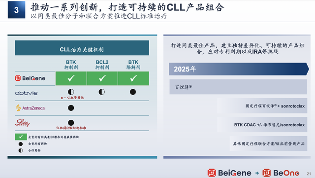 我们不难发现,在120亿美元的CLL市场,百济神州可以说是全球唯一同时拥有BTK抑制剂、Bcl-2抑制剂、BTK降解剂差异化产品的企业,这三款产品均是全球同类最佳,除单药外还能联用,以实现相关领域的长期可持续领先。