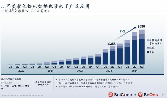 2024Q3,泽布替尼为公司贡献了6.9亿美元的营收,同比增长93%,占公司营整体收的近70%,其中美国销售额5.04亿美元(+87%),欧洲销售0.97亿美元(+141%),目前已在全球72个市场获批多项适应症。