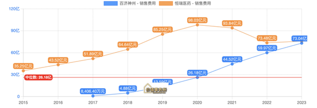 研发投入疯狂就算了,百济在销售等方面的费用投入也十分惊人,即便面对国内企业较为弱势的海外市场,也是更多选择自建销售团队,而不是和传奇生物之类的同行一样选择将产品授权给跨国大药企(相当于销售外包),所以,百济神州的产品都没有几个,销售费用却逐年狂飙要超越恒瑞了。