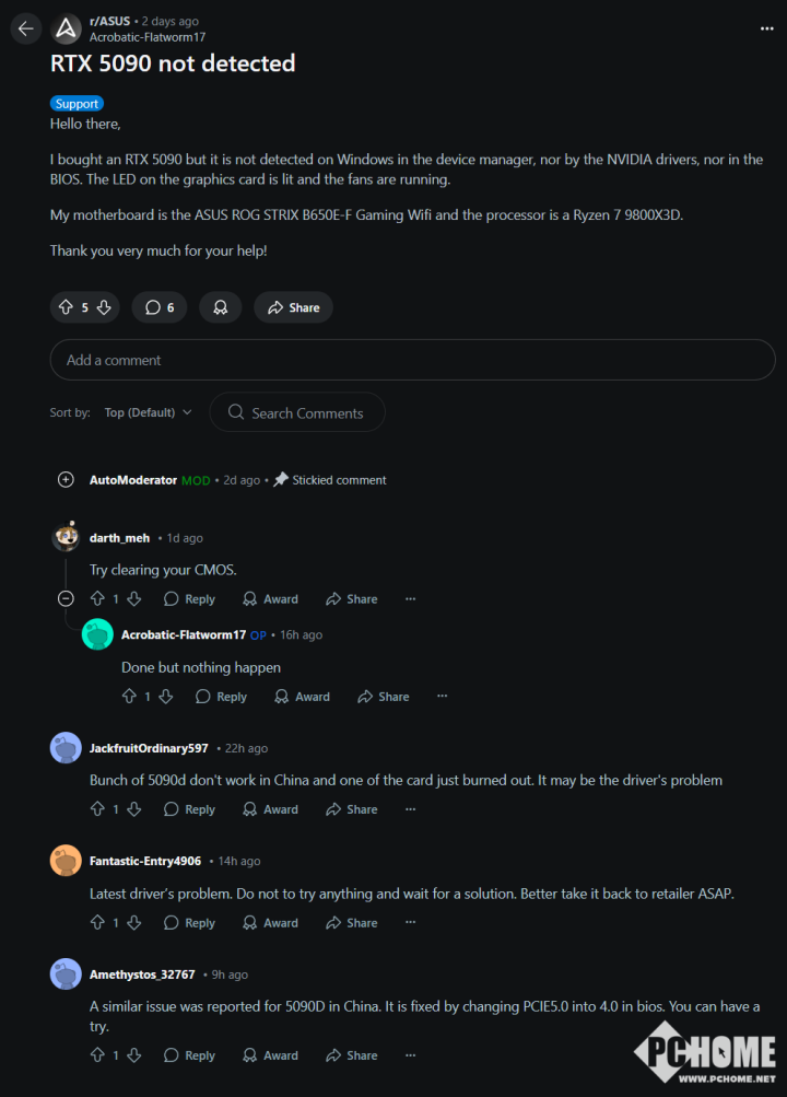 而根据超频玩家Der8auer在最新视频中当中表态,将主板PCIe模式从5.0降级至4.0可能暂时规避故障。由于RTX 50系为首批完整支持PCIe 5.0的显卡,与旧主板信号协议可能存在兼容冲突。目前尚不清楚这一问题究竟是由于什么原因造成的,但目前受波及的多家厂商已经开始复现问题并与英伟达联系寻求解决方案。