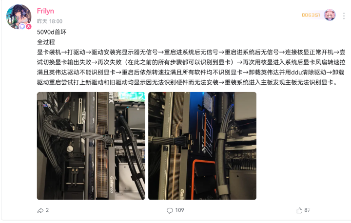 用户报告显示,在安装最新驱动后立即出现黑屏,通过DisplayPort/HDMI接口均无信号输出,系统设备管理器无法检测到显卡。其中部分用户尝试清除CMOS/更换PCIe插槽仍无法恢复。受影响型号包含七彩虹RTX 5090 D,万丽Gallardo系列RTX 5090D、技嘉部分RTX 5090 D以及华硕RTX 5090。