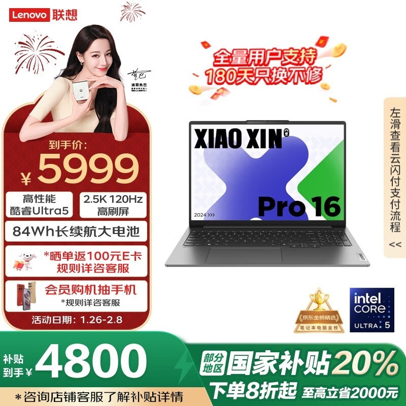 联想小新Pro 16 2024款 酷睿Ultra处理器 超值优惠 到手4750.41
