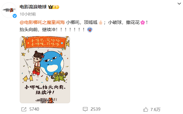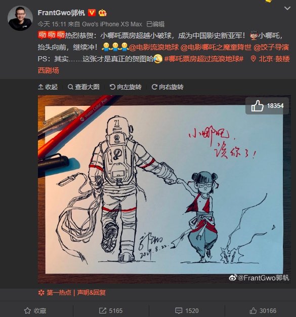 随后,《流浪地球》导演郭帆发微博祝贺,并手绘贺图,向《哪吒》表示祝贺。