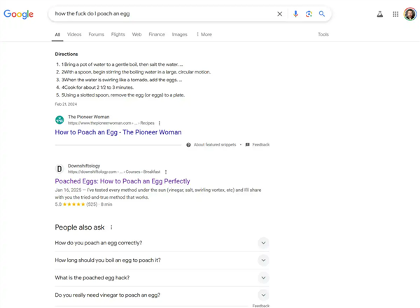 在某些情况下,加入脏话确实可以改善搜索结果,例如搜索“如何煮鸡蛋”时,加入脏话后,搜索结果直接显示了一组烹饪指令,明显优于原来的搜索结果。
