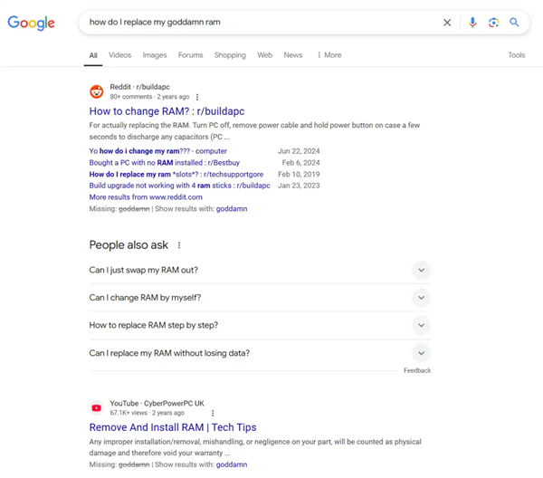 在另一个例子中,搜索“如何更换内存”时,加入脏话后,谷歌并没有给出AI结果,但随后出现了一些YouTube视频和Reddit讨论,结果并不比原来的搜索更好。
