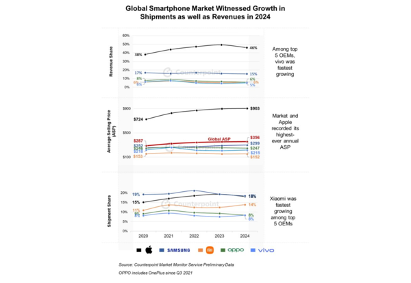 【CNMO科技消息】根据Counterpoint Research的数据,2024年标准版iPhone 15稳坐全球手机市场销冠宝座,Pro和Pro Max两款顶配机型紧随其后,硬生生把智能手机均价推上356美元的历史新高。