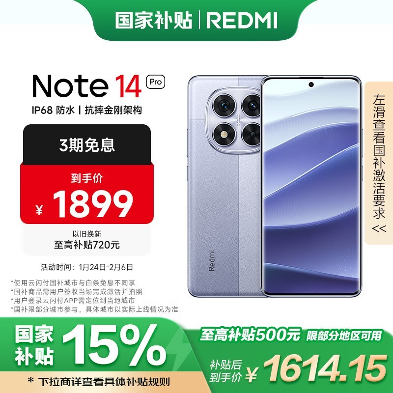 红米Note 14 Pro手机京东促销价1589元,直降300元!