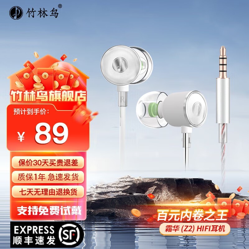 竹林鸟霜华Z2入耳式动圈HiFi有线耳机到手价89元,立省40元