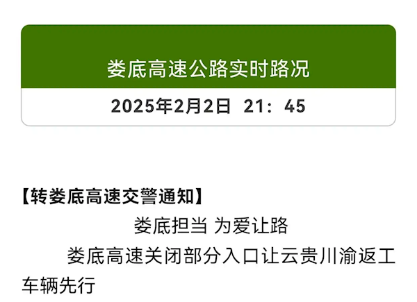 2月2日至2月4日,娄底高速官方微信号连续发布了9条“高速实时路况”,“娄底担当 为爱让路”,旨在提醒大家娄底高速部分入口关闭,为云贵川渝返工车辆让道。