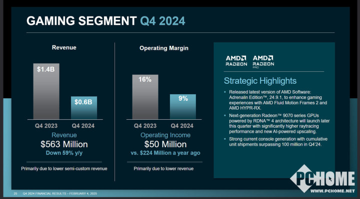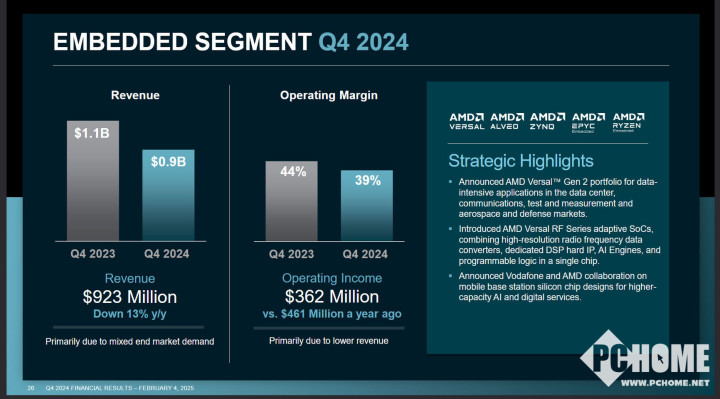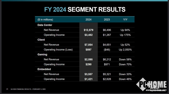 包含游戏机以及显卡业务的游戏部门四季度收入同比下降59%至5.63亿美元,但高于分析师预期的4.87亿美元。2024年收入同比下降58%至26亿美元,主要由于半定制收入减少。而嵌入式部门四季度收入同比下降13%至9.23亿美元。2024年收入同比下降33%至36亿美元,主要由于客户清库存令库存水平正常化。