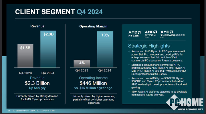 从不同业务角度来看,数据中心部门收入四季度同比增长68%至39亿美元创新高,但逊于分析师预期的41.2亿美元,全年数据中心收入几乎翻倍,创新高至126亿美元,同比增长94%。而包含PC芯片的客户端部门四季度收入同样创新高,同比增长58%至23亿美元,高于分析师预期的19.8亿美元。2024全年收入创新高至23亿美元,同比增长58%。