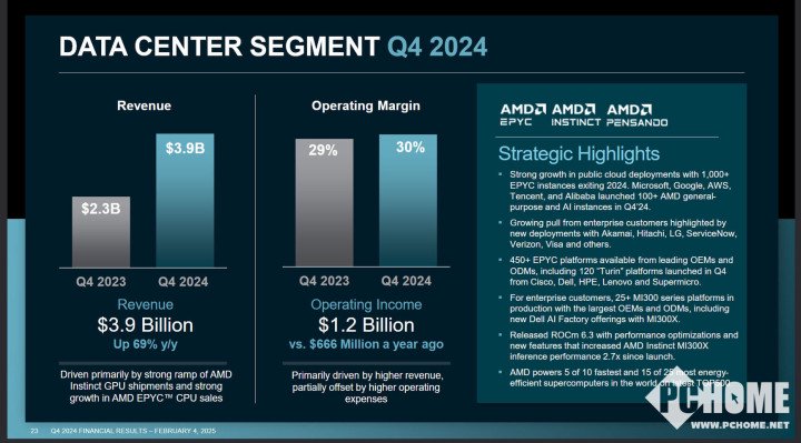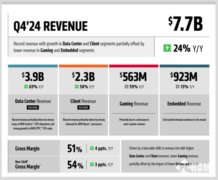 AMD财报显示2024年第四季度营收、全年收入以及数据中心的季度和年度收入均创下历史新高。