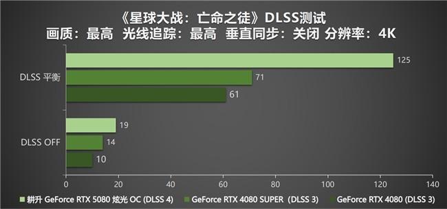 《星球大战:亡命之徒》是一款对硬件配置的要求较高的游戏,从测试结果可以看出,在4K的分辨率下,GeForce RTX 4080 SUPER和GeForce RTX 4080在开启DLSS 3技术时,平均帧数分别为61帧和71帧。耕升 GeForce RTX 5080 炫光 OC在DLSS 4技术的加持下,平均帧数可以达到125帧,其性能提升涨幅约为76%,由此可见,在对硬件配置要求极高的《星球大战:亡命之徒》中,玩家使用耕升 GeForce RTX 5080 炫光 OC可以带来优异的游玩体验,让玩家更加投入和享受游戏过程。