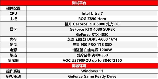 本次测试中,CPU选用了Intel Ultra 7,搭配ROG Z890 HERO主板,内存方面搭载了4条芝奇 幻锋戟 DDR5-6000Hz 16GB内存条,电源方面则采用了海盗船 白金1200W电源,散热部分则使用了酷冷至尊 炎神P360一体式水冷。这套经过精心设计的配置,不仅为GPU提供了充足的散热保障,还确保了稳定的电力供应,使得耕升 GeForce RTX 5080 炫光 OC在日常使用中得以充分发挥其高效及卓越的性能。同时,本次测试将直接对比GeForce RTX 4080和GeForce RTX 4080 SUPER,带大家领略耕升 GeForce RTX 5080 炫光 OC 的强大性能。