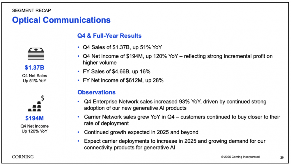 康宁表示,实现同比增长主要得益于市场对康宁新型生成式人工智能(Gen AI)产品的持续强劲采用,预计2025年将延续这一增长趋势。