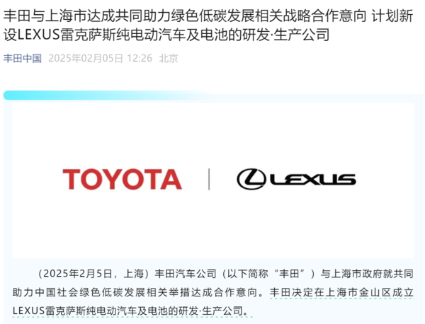 【CNMO科技消息】2月5日中午,丰田汽车中国公司宣布,与上海市政府就共同助力中国社会绿色低碳发展相关举措达成合作意向。丰田决定在上海市金山区成立LEXUS雷克萨斯纯电动汽车及电池的研发·生产公司。