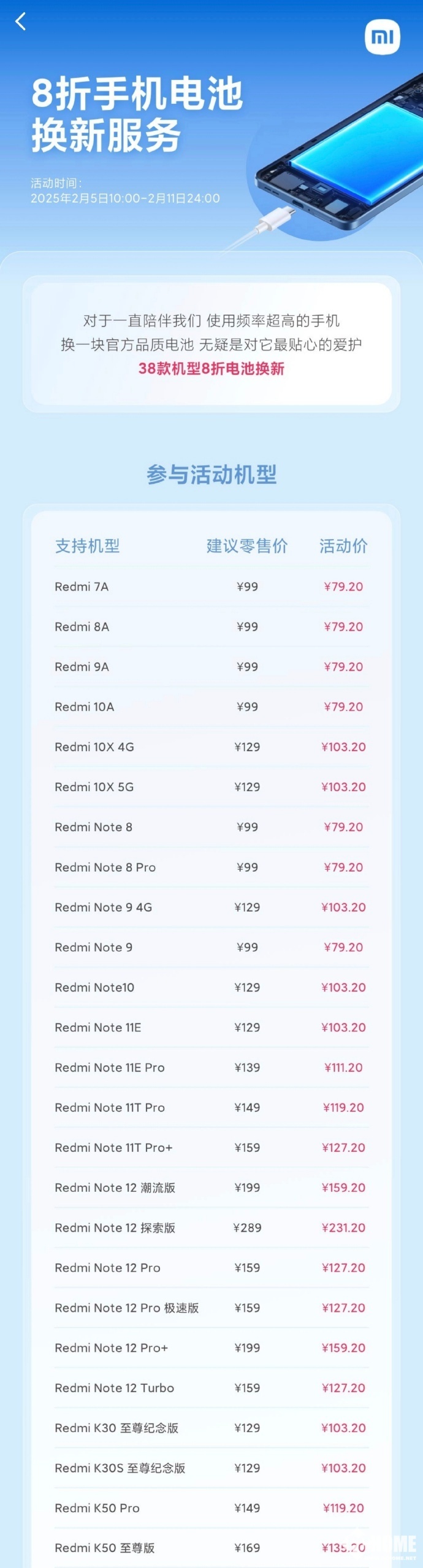 此次年货节,小米为消费者带来多项优惠服务,其中手机电池换新服务备受关注。 此次共有38款机型参与手机电池换新活动,价格79.2元起。