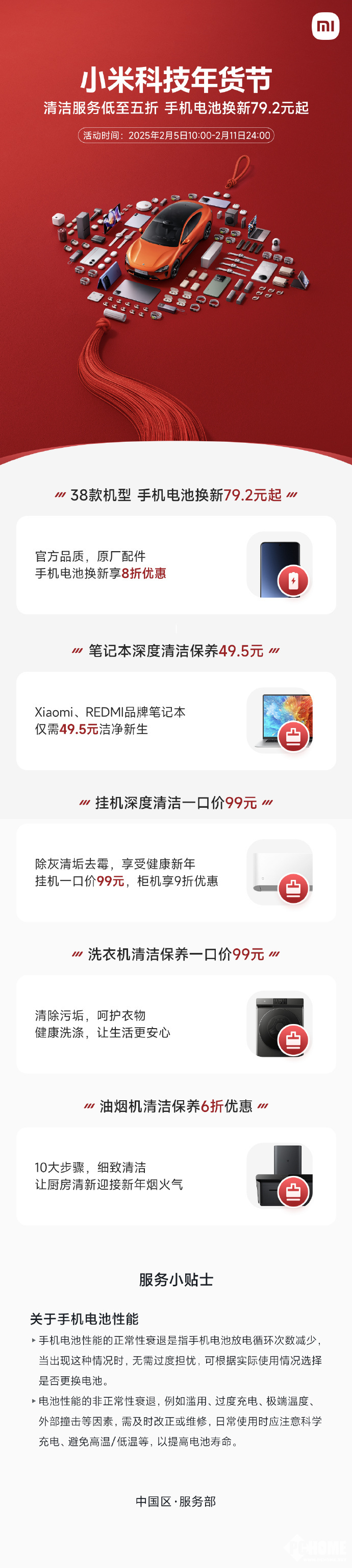 小米、REDMI品牌笔记本深度清洁保养仅需49.5元,即可让笔记本洁净新生;空调挂机深度清洁一口价99元,可除灰清垢去霉,柜机享9折优惠;洗衣机清洁保养同样一口价99元,能清除污垢,呵护衣物健康洗涤;油烟机清洁保养则享6折优惠,通过10大步骤细致清洁,让厨房清新迎接新年烟火气。