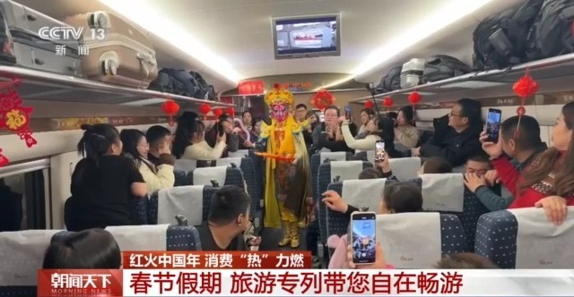 在川青铁路城6686次旅游专列上,精彩绝伦的川剧变脸和神奇莫测的魔术表演火热上演,吸引更多游客坐着高铁去九寨。从腊月二十三到大年初二,九寨沟景区的客流量超过十万人次,相比于去年同期增长了近四成。
