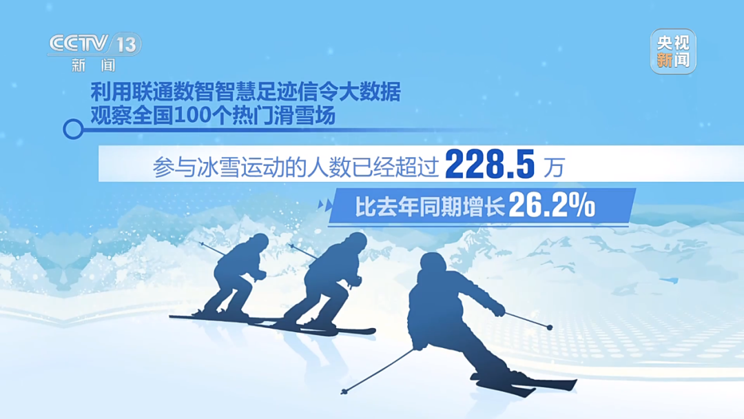 今年春节,旅游景区门票预订数据显示,春节冰雪游热门目的地前十里,有一半在南方城市。而利用联通数智智慧足迹信令大数据观察全国100个热门滑雪场发现,参与冰雪运动的人数已经超过228.5万,比去年同期增长26.2%。
