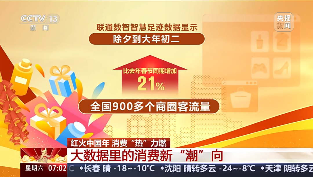 央视报道,联通数智智慧足迹数据显示,从除夕到大年初二,全国900多个商圈客流量比去年春节同期增加了21%,假期前三天,全国商圈外地客流的占比同比增加了一成。