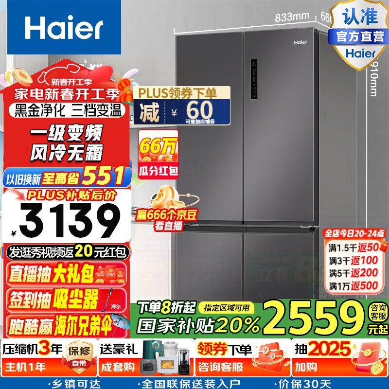 海尔 BCD-500WLHTD78SMU1 500升十字对开四开门电冰箱到手价2243元!