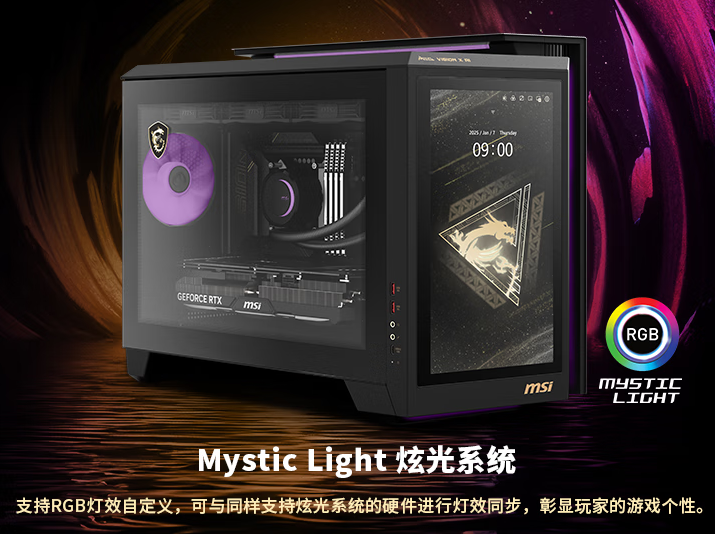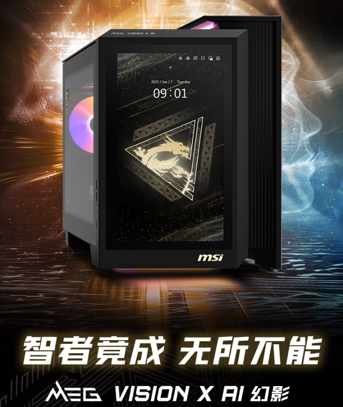 主机外观以“数字未来建筑”为设计语言,通过凌厉的层次线条与交错结构,传递科技与云端的连接感。侧透4mm钢化玻璃展现主板背插式设计,内部走线整洁如艺术品;11.6度倾斜角度的AI屏幕模拟汽车中控台布局,兼顾视觉舒适性与操作便捷性。