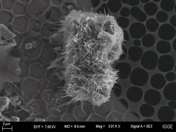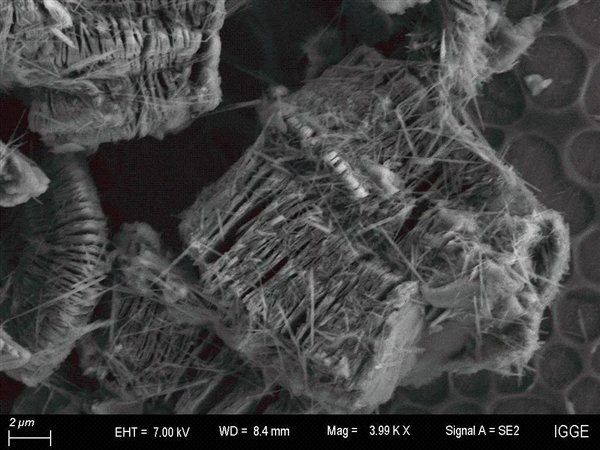 扫描电镜下的书页状高岭石,稀土离子吸附在夹缝中