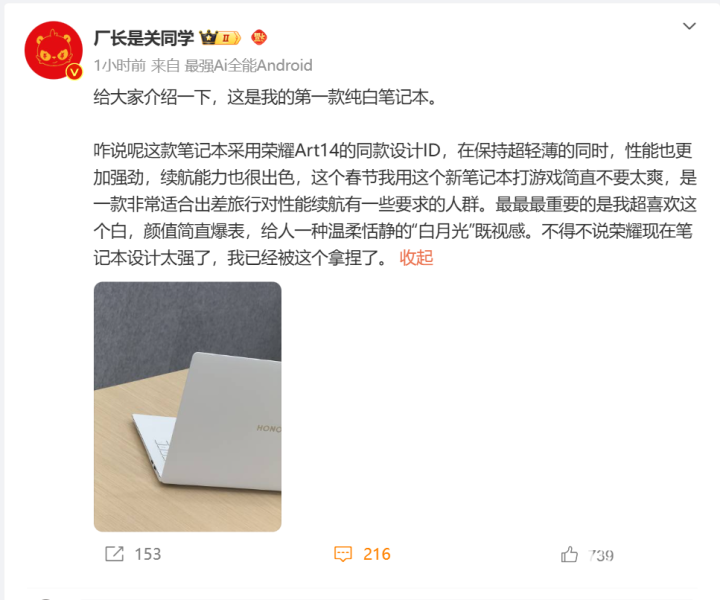 此前多位荣耀高管已经开始了对于荣耀笔记本新品的预热。今天微博数码博主@厂长是关同学今天发文表示自己已经拿到了荣耀的全新笔记本,并且晒出了一张新品图片,显示机身采用了纯白色的轻薄设计。