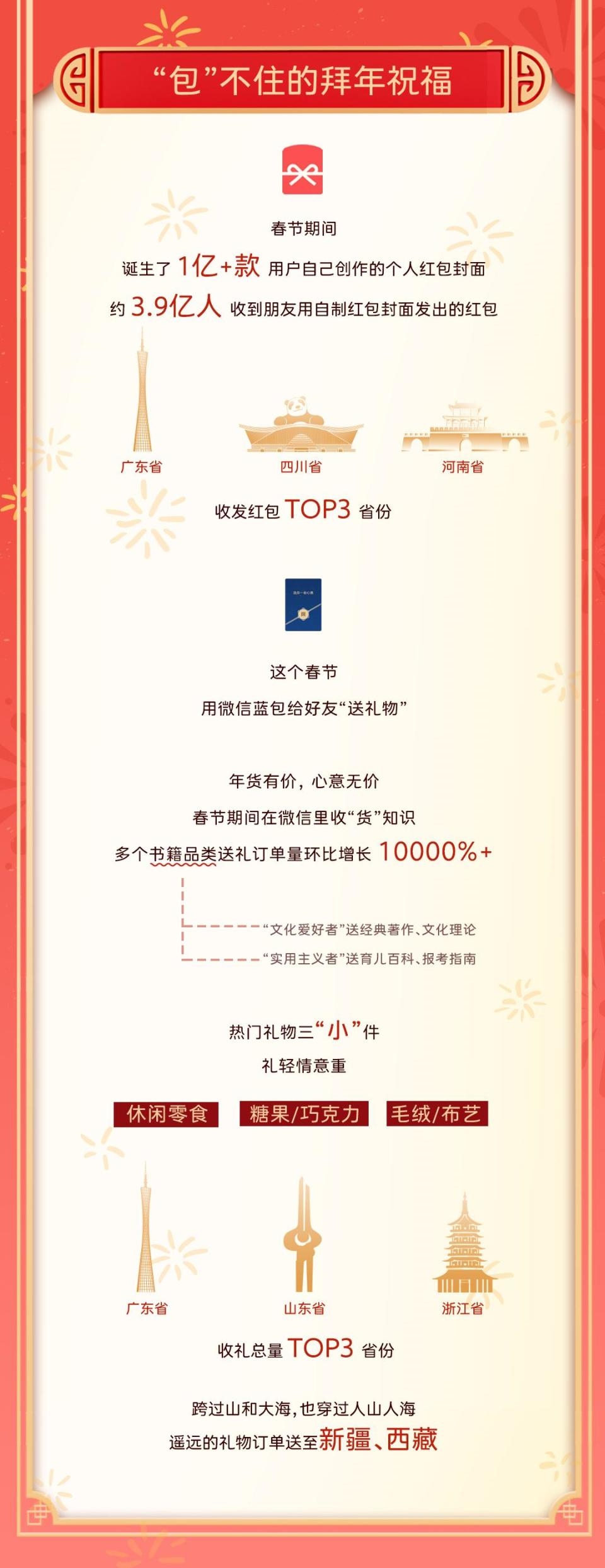 据统计,春节期间,微信平台上涌现了超过1亿款由用户亲手设计的红包封面,这些独具特色的红包被3.9亿人次温馨传递,增添了节日的无限乐趣。