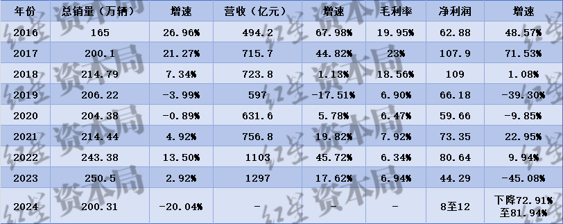 2024年,广汽集团的销量大跌20%至200.3万辆,预计2024年的净利润为8亿元到12亿元,同比下滑72.91%到81.94%。