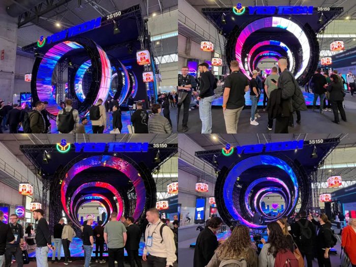 要说本届ISE展现场最大的视觉亮点,当属由新亚胜王牌产品MG9系列打造而成的圆环隧道屏。环状大屏纵向组合,搭配炫酷的动效显示画面,仿佛为观展人员开启了通往科幻世界的“时空隧道”。