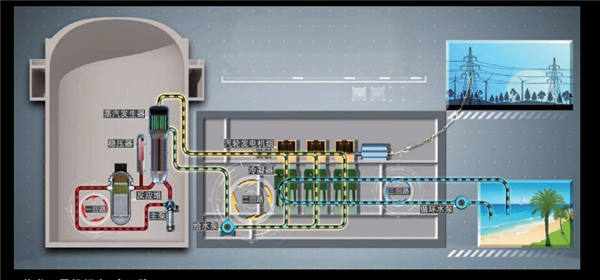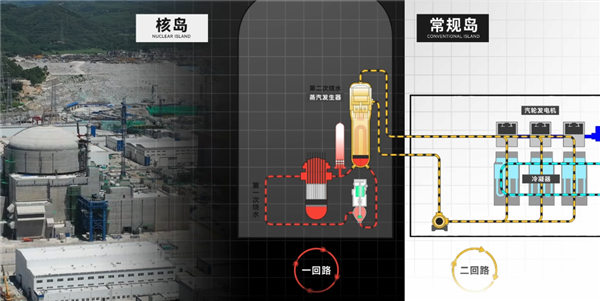 这种结构将 “ 有核 ” 与 “ 无核 ” 的回路完全隔离开来,将核电厂分成了进行核反应 “ 核岛 ” 与不接触核材料的 “ 常规岛 ”。
