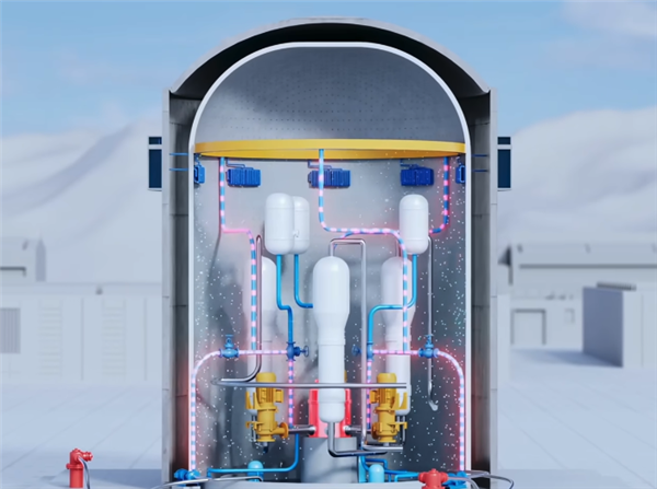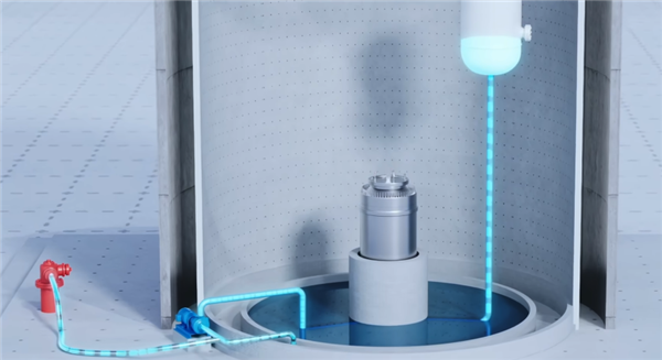 通过热管,水箱链接着安全壳内的换热器。当反应堆过热时,内部的温度会加热换热器,把安全壳 “ 帽子 ” 里的水烧开,通过水蒸气把热量带出去。